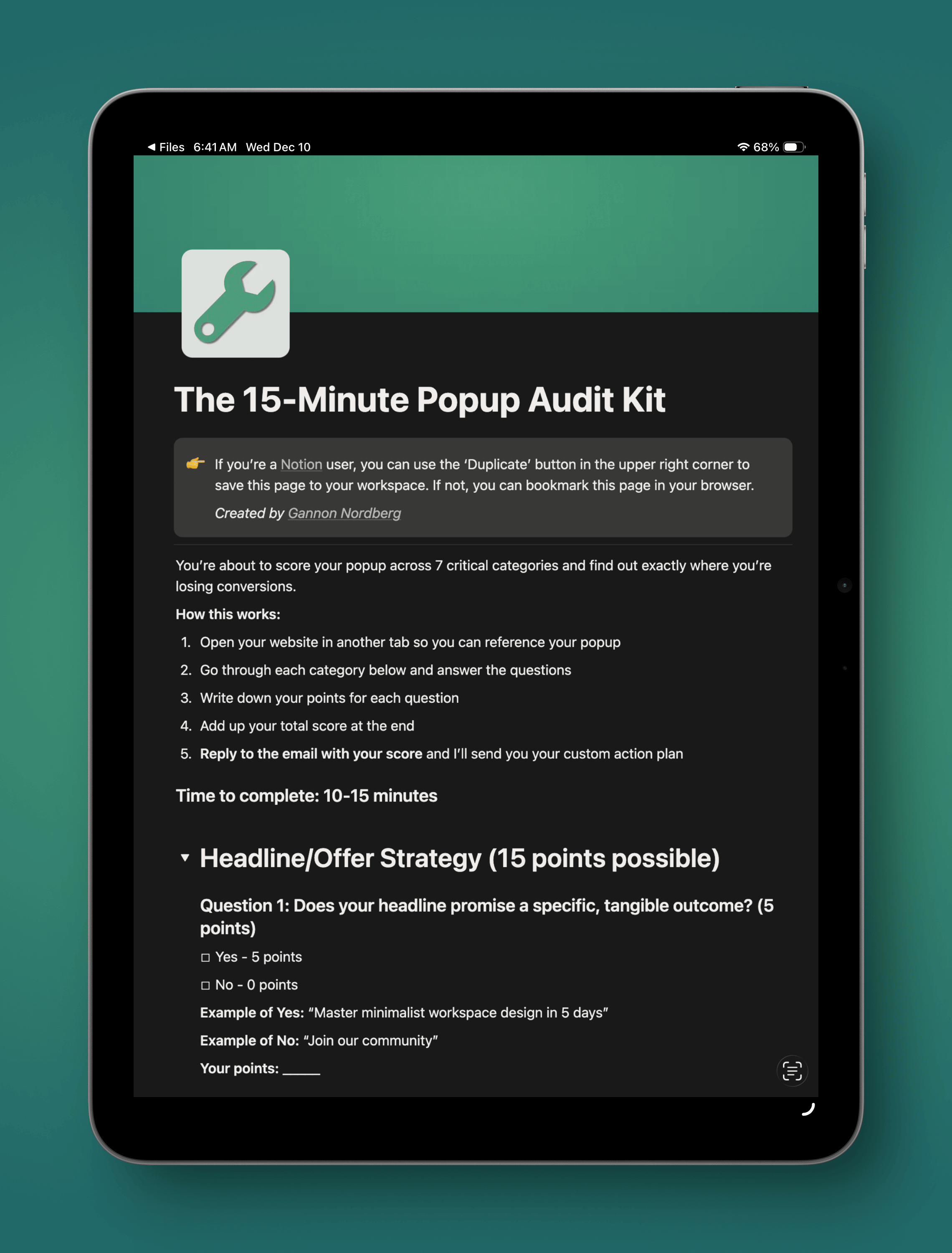 THE 15-MINUTE POPUP AUDIT KIT scores your website popup across 7 critical categories and shows you exactly where you’re losing conversions.